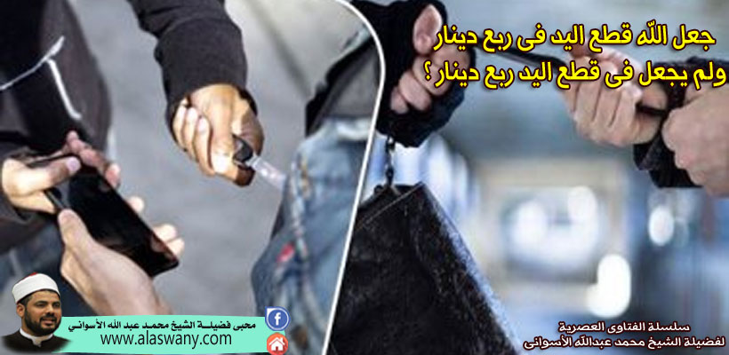ج : لأن السارق ربما يكون محتاجًا وإنه لو اعتدى فإنما اعتدى على ملكك أما إذا قطع شخص يد غيره كان متعدياً على ذاته فكانت العقوبة أروع وأشد وهذا حفاظًا على ذات الإنسان فلو كان فى قطع اليد ربع دينار لجاء شخص وقطع يد شخص آخر ودفع له ثمنها , وهذا كله حفاظًا على الذات البشرية .