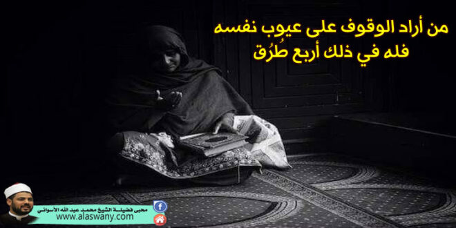 من أراد الوقوف على عيوب نفسه فله في ذلك أربع طُرُق: الطريقة الأولى: أن يجلِسَ بين يدي شيخٍ بصيرٍ بٍعُيوبِ النفس يُعَرِّفُه عيوب نفسِه وطُرُقَ علاجها, وهذا قد عزَّ في هذا الزمان وجودُه, فمن وقع به فقد وقعَ بالطبيب الحاذق, فلا ينبغي أن يُفارِقَه. الطريقة الثانية: أن يطلُبَ صديقًا صدوقًا …