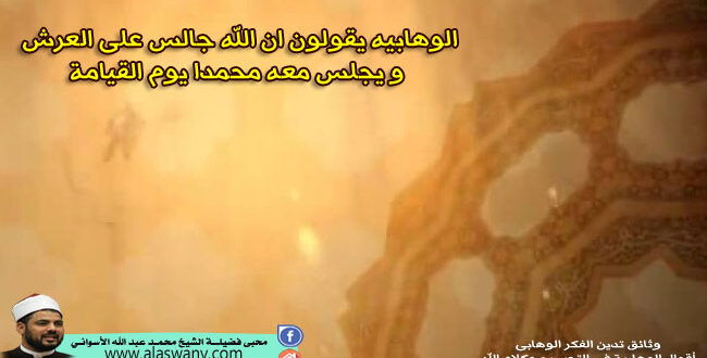 • من ضلالات الوهابية أنهم يعتقدون أن الله جسم! فصاروا يبحثون له عن مكان! • فانقسموا بذلك إلى عدة فرق، فقال بعض الوهابية: هو في السماء تمسكًا بظاهر رواية من روايات حديث الجارية – المضطرب. • وقال بعض الوهابية: بل هو يجلس على العرش كما في كتاب شيخهم الحراني مجموع …