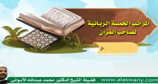 - المراتب الخمسة الربانية لصاحب القرآن : • الشفاعة : «فإنه يأتي يوم القيامة شفيعًا لأصحابه”. • الرِفعة : “فإن منزلتك عند آخر آيةٍ تقرؤها”. • الصُحبة : “مع السفرة الكرام البررة”. • الخيرية : “خيركم من تعلم القرآن وعلمه”. • الأهلية : “أهل القرآن أهل الله وخاصته”.